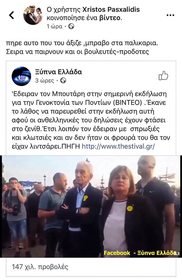 Συγκεκριμένα ο κ.Πασχαλίδης έγραψε: «Πήρε αυτό που του άξιζε, μπράβο στα παλικάρια. Σειρά να παίρνουν και οι βουλευτές προδότες» ενώ κάτω από το σχόλιο είχε κοινοποίησει ανάρτηση ομάδας στο Facebook όπου επίσης σχολιαζόταν η επίθεση ως εξής: «Έδειραν τον Μπουτάρη στην σημερινή εκδήλωση για την Γενοκτονία των Ποντίων. Έκανε το λάθος να παρευρεθεί στην εκδήλωση αυτή αφού οι ανθελληνικές του δηλώσεις έχουν φτάσει στο ζενίθ. Έτσι λοιπόν τον έδειραν με σπρωξιές και κλωτσιές και εάν δεν ήταν οι φρουρά του θα τον είχαν λιντσάρει».